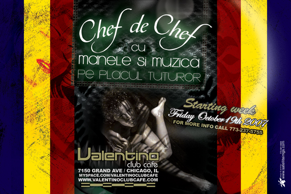 Valentino Club Cafe (club) Valentino Club Cafe7150 W. Grand AveChicago , IL 60707Tel: 773-237-5755Bucatarie si meniu European. Seara romaneasca in fiecare vineri seara. Prev Next